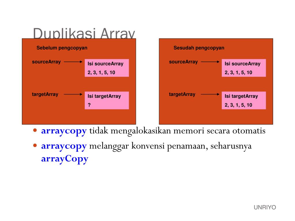 Duplikasi Array • Menyalin isi suatu array ke array yang lain • Cara yang salah: int [] sourceArray = {2, 3, 1, 5, 10}; int [] targetArray; targetArray = sourceArray; Sebelum targetArray = source Array; Sesudah targetArray = source Array; sourceArray sourceArray Isi sourceArray 2, 3, 1, 5, 10 Isi sourceArray 2, 3, 1, 5, 10 targetArray targetArray Isi targetArray ? Isi targetArray ?