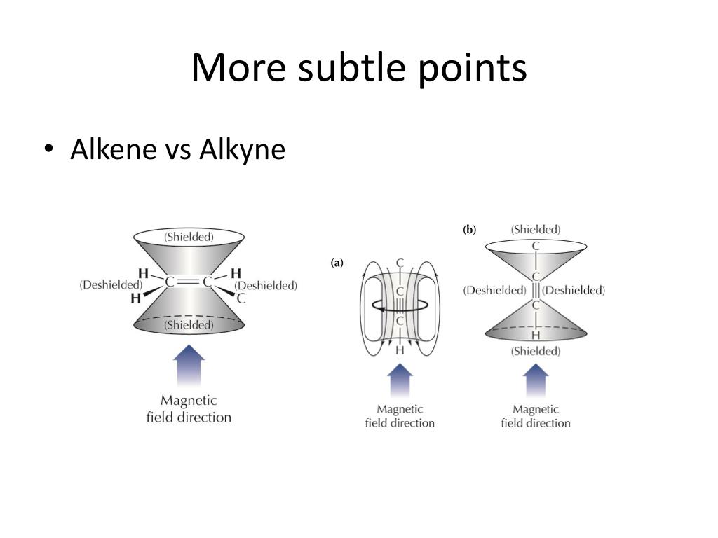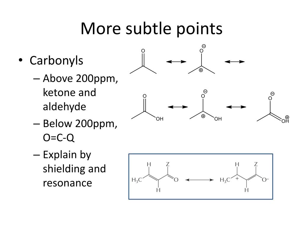 More subtle points • Carbonyls • Above 200ppm, ketone and aldehyde • Below 200ppm, O=C-Q • Explain by shielding and resonance