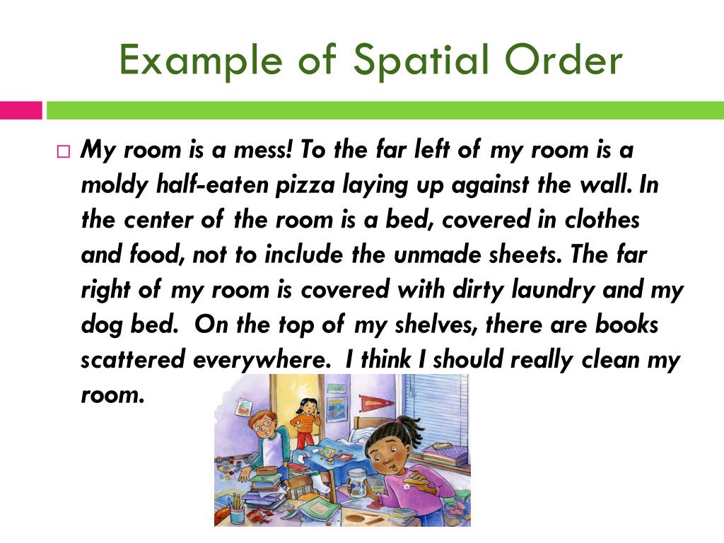 Example of Spatial Order • My room is a mess! To the far left of my room is a moldy half-eaten pizza laying up against the wall. In the center of the room is a bed, covered in clothes and food, not to include the unmade sheets. The far right of my room is covered with dirty laundry and my dog bed. On the top of my shelves, there are books scattered everywhere. I think I should really clean my room.