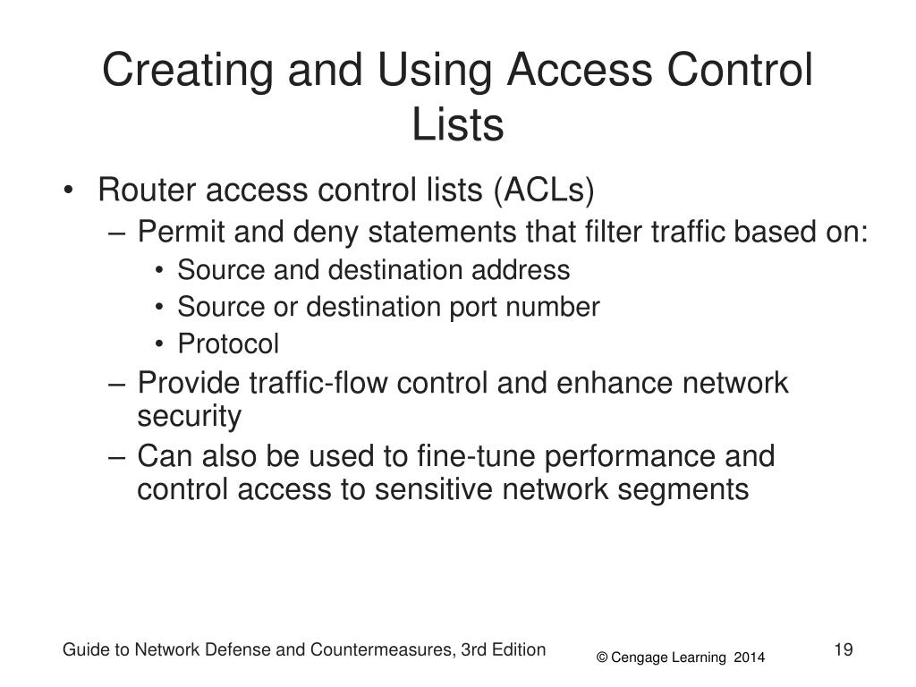 Creating and Using Access Control Lists • Router access control lists (ACLs) • Permit and deny statements that filter traffic based on: • Source and destination address • Source or destination port number • Protocol • Provide traffic-flow control and enhance network security • Can also be used to fine-tune performance and control access to sensitive network segments Guide to Network Defense and Countermeasures, 3rd Edition