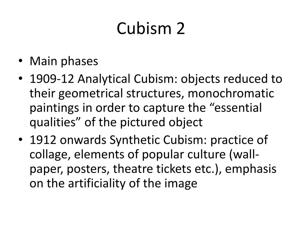 Cubism2 • Mainphases • 1909-12 AnalyticalCubism: objectsreducedtotheirgeometricalstructures, monochromaticpaintings in ordertocapture the “essentialqualities” of the picturedobject • 1912 onwardsSyntheticCubism: practiceof collage, elementsofpopular culture (wall-paper, posters, theatretickets etc.), emphasis on the artificialityof the image