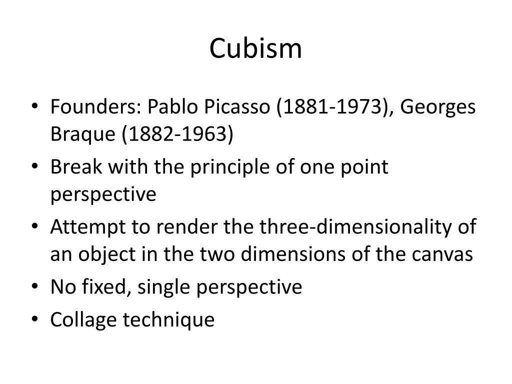 Cubism • Founders: Pablo Picasso (1881-1973), Georges Braque (1882-1963) • Break with the principleofonepointperspective • Attemptto render the three-dimensionalityofanobjectin the twodimensionsof the canvas • No fixed, single perspective • Collage technique
