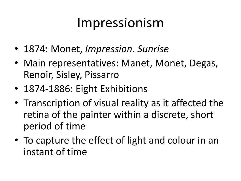 Impressionism • 1874: Monet, Impression. Sunrise • Mainrepresentatives: Manet, Monet, Degas, Renoir, Sisley, Pissarro • 1874-1886: EightExhibitions • Transcriptionofvisual reality asitaffected the retina of the painterwithin a discrete, short periodoftime • Tocapture the effectof light and colour in aninstantoftime