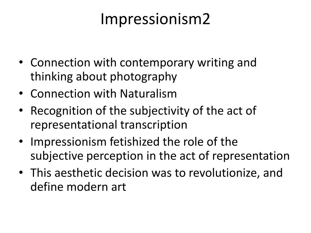 Impressionism2 • Connection withcontemporarywriting and thinkingaboutphotography • Connection withNaturalism • Recognitionof the subjectivityof the actofrepresentationaltranscription • Impressionismfetishized the roleof the subjectiveperception in the actofrepresentation • Thisaestheticdecisionwastorevolutionize, and definemodern art