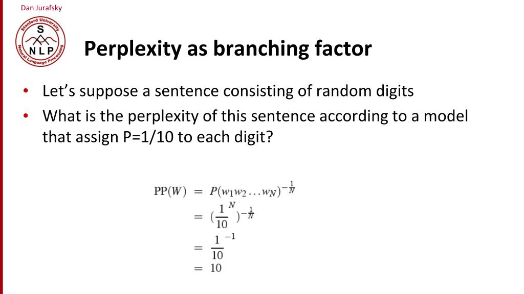 Perplexity as branching factor Let’s suppose a sentence consisting of random digits What is the perplexity of this sentence according to a model that assign P=1/10 to each digit?