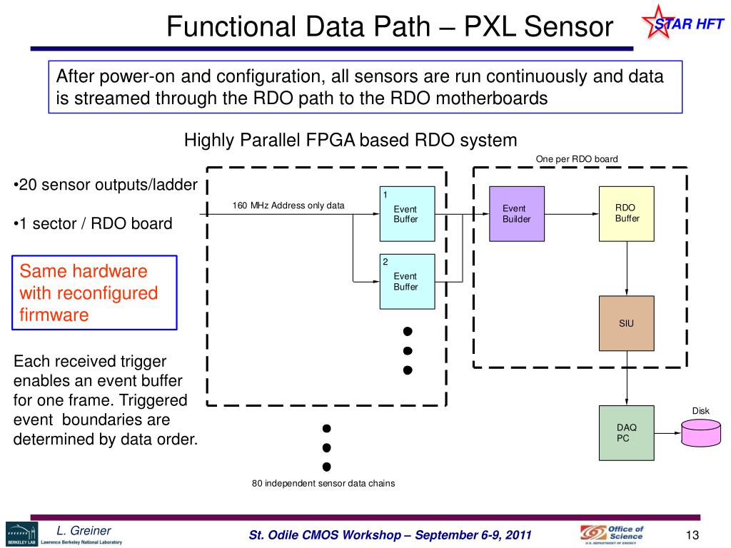 Functional Data Path – PXL Sensor After power-on and configuration, all sensors are run continuously and data is streamed through the RDO path to the RDO motherboards Highly Parallel FPGA based RDO system • 20 sensor outputs/ladder • 1 sector / RDO board Same hardware with reconfigured firmware Each received trigger enables an event buffer for one frame. Triggered event boundaries are determined by data order.