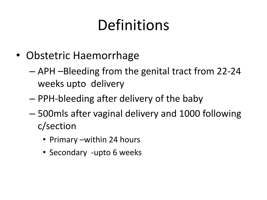 Definitions • Obstetric Haemorrhage • APH –Bleeding from the genital tract from 22-24 weeks upto delivery • PPH-bleeding after delivery of the baby • 500mls after vaginal delivery and 1000 following c/section • Primary –within 24 hours • Secondary -upto 6 weeks