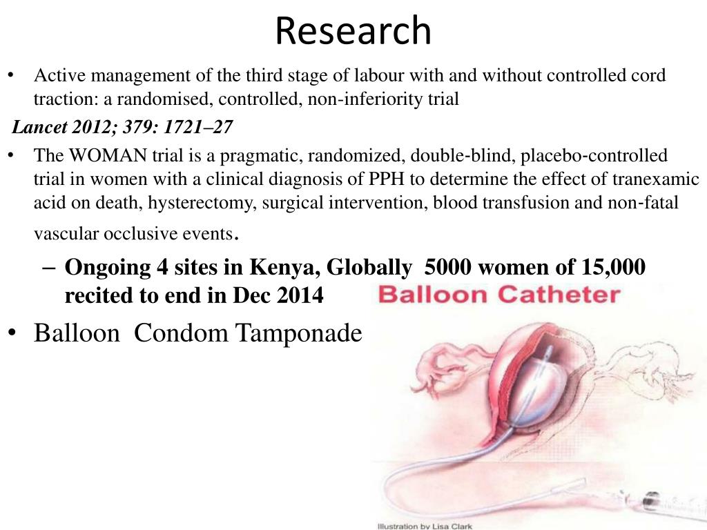 Research • Active management of the third stage of labour with and without controlled cord traction: a randomised, controlled, non-inferiority trial Lancet 2012; 379: 1721–27 • The WOMAN trial is a pragmatic, randomized, double‐blind, placebo‐controlled trial in women with a clinical diagnosis of PPH to determine the effect of tranexamic acid on death, hysterectomy, surgical intervention, blood transfusion and non‐fatal vascular occlusive events. • Ongoing 4 sites in Kenya, Globally 5000 women of 15,000 recited to end in Dec 2014 • Balloon Condom Tamponade