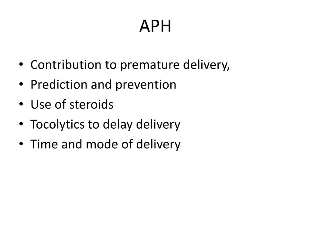 APH • Contribution to premature delivery, • Prediction and prevention • Use of steroids • Tocolytics to delay delivery • Time and mode of delivery