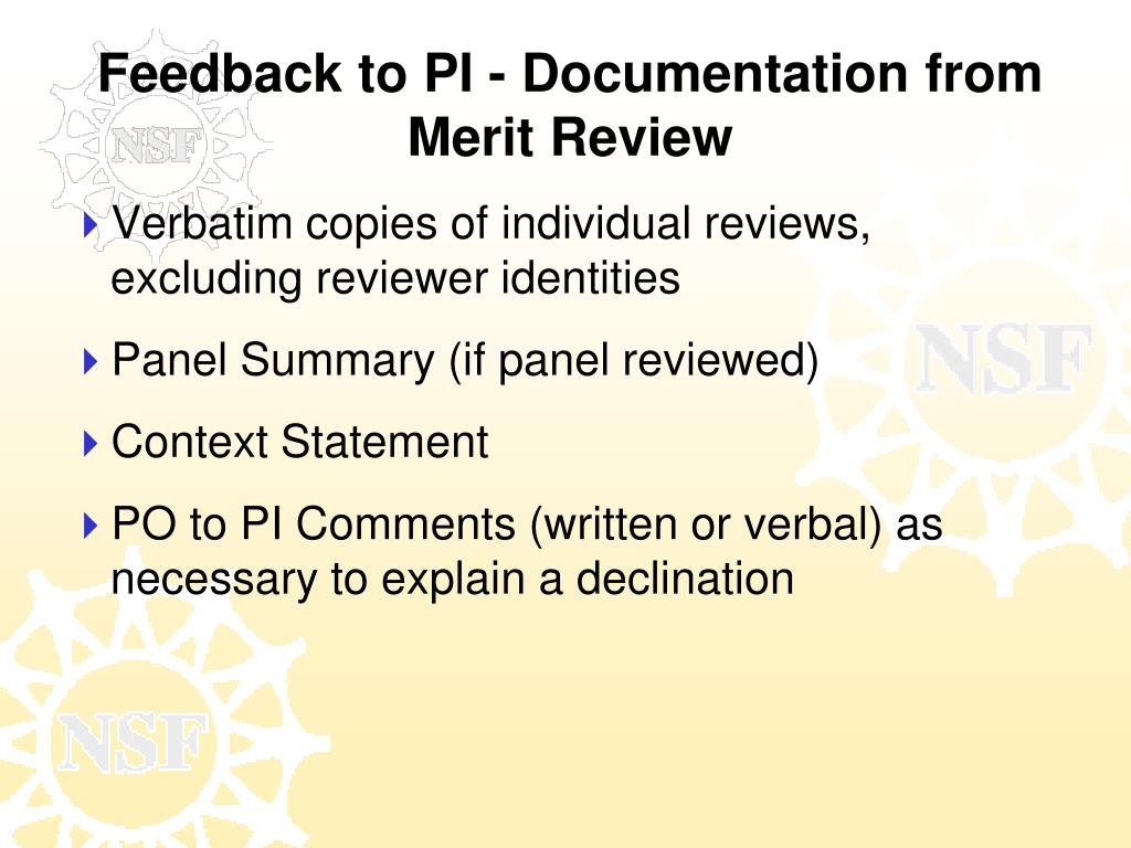 Feedback to PI - Documentation from Merit Review • Verbatim copies of individual reviews, excluding reviewer identities • Panel Summary (if panel reviewed) • Context Statement • PO to PI Comments (written or verbal) as necessary to explain a declination