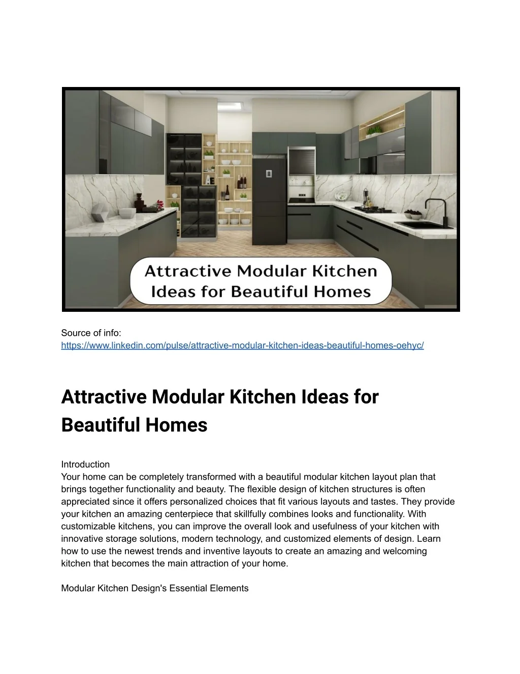 Source of info: https://www.linkedin.com/pulse/attractive-modular-kitchen-ideas-beautiful-homes-oehyc/ Attractive Modular Kitchen Ideas for Beautiful Homes Introduction Your home can be completely transformed with a beautiful modular kitchen layout plan that brings together functionality and beauty. The flexible design of kitchen structures is often appreciated since it offers personalized choices that fit various layouts and tastes. They provide your kitchen an amazing centerpiece that skillfully combines looks and functionality. With customizable kitchens, you can improve the overall look and usefulness of your kitchen with innovative storage solutions, modern technology, and customized elements of design. Learn how to use the newest trends and inventive layouts to create an amazing and welcoming kitchen that becomes the main attraction of your home. Modular Kitchen Design's Essential Elements