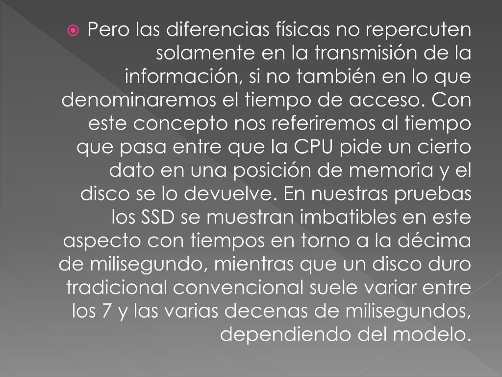Pero las diferencias físicas no repercuten solamente en la transmisión de la información, si no también en lo que denominaremos el tiempo de acceso. Con este concepto nos referiremos al tiempo que pasa entre que la CPU pide un cierto dato en una posición de memoria y el disco se lo devuelve. En nuestras pruebas los SSD se muestran imbatibles en este aspecto con tiempos en torno a la décima de milisegundo, mientras que un disco duro tradicional convencional suele variar entre los 7 y las varias decenas de milisegundos, dependiendo del modelo.