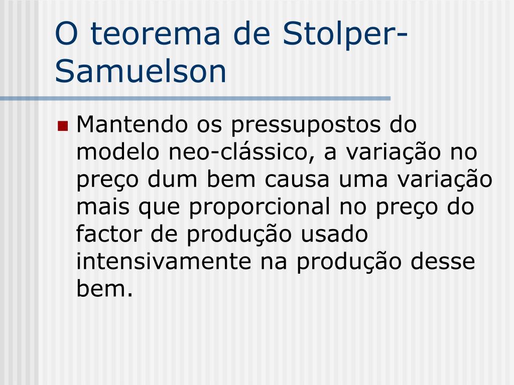 O teorema de Stolper-Samuelson • Mantendo os pressupostos do modelo neo-clássico, a variação no preço dum bem causa uma variação mais que proporcional no preço do factor de produção usado intensivamente na produção desse bem.