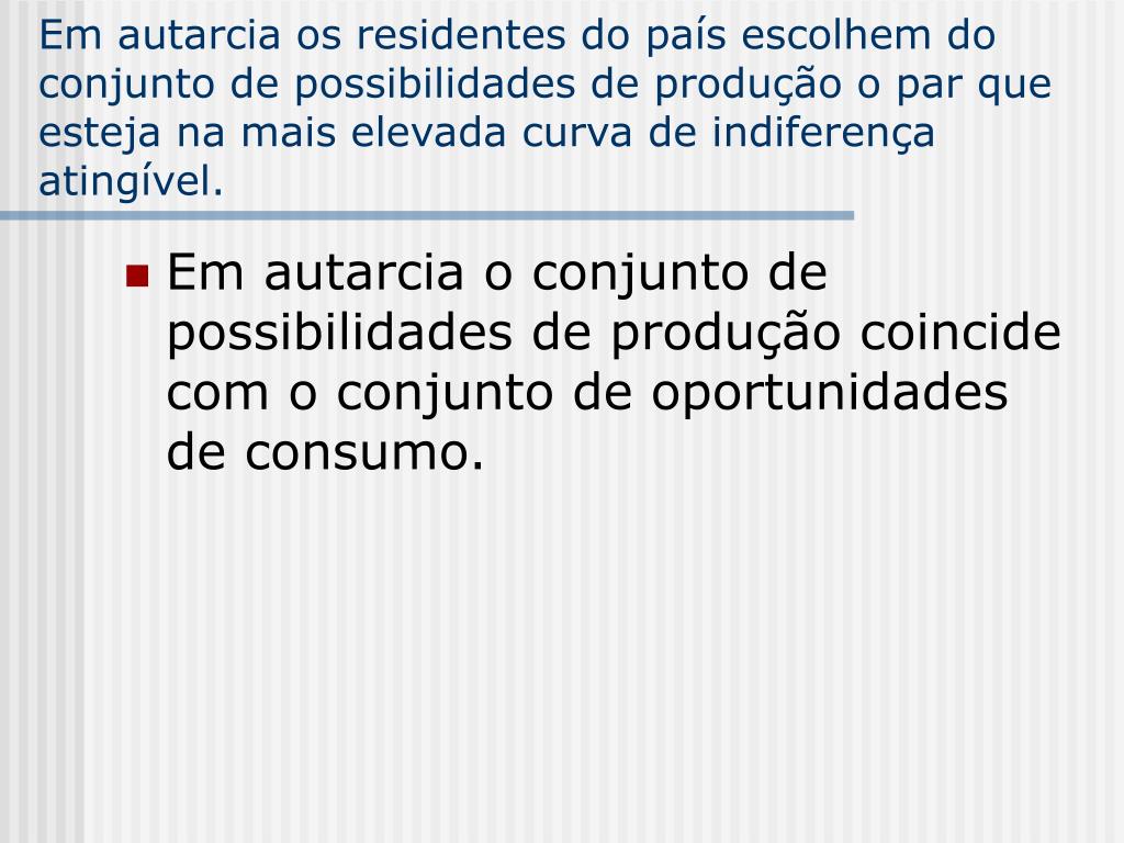 Em autarcia os residentes do país escolhem do conjunto de possibilidades de produção o par que esteja na mais elevada curva de indiferença atingível. • Em autarcia o conjunto de possibilidades de produção coincide com o conjunto de oportunidades de consumo.