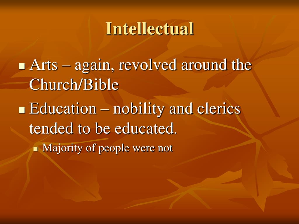 Intellectual • Arts – again, revolved around the Church/Bible • Education – nobility and clerics tended to be educated. • Majority of people were not