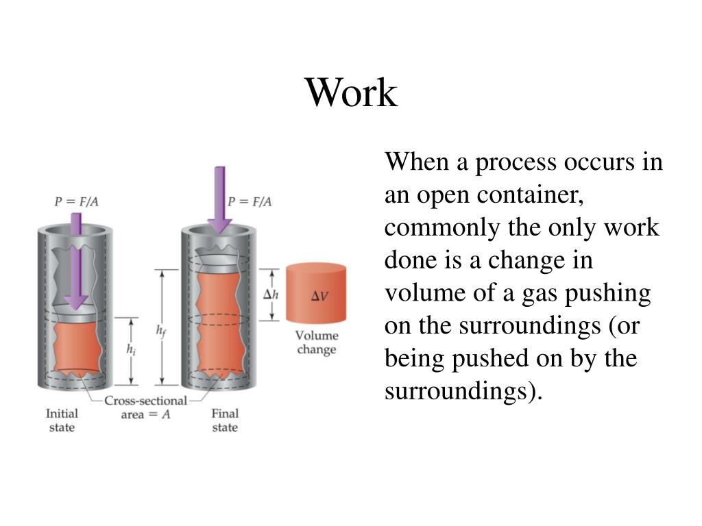 Work When a process occurs in an open container, commonly the only work done is a change in volume of a gas pushing on the surroundings (or being pushed on by the surroundings).