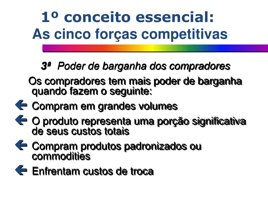 1º conceito essencial:As cinco forças competitivas 3ªPoder de barganha dos compradores Os compradores tem mais poder de barganha quando fazem o seguinte: • Compram em grandes volumes • O produto representa uma porção significativa de seus custos totais • Compram produtos padronizados ou commodities • Enfrentam custos de troca