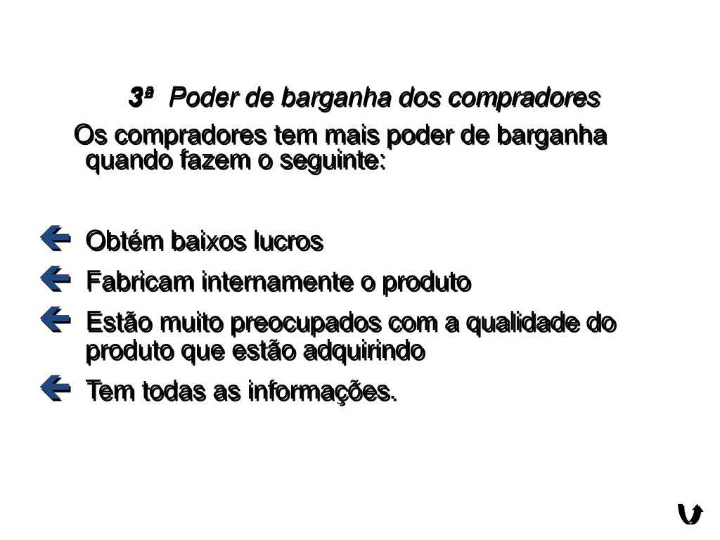 3ªPoder de barganha dos compradores Os compradores tem mais poder de barganha quando fazem o seguinte: • Obtém baixos lucros • Fabricam internamente o produto • Estão muito preocupados com a qualidade do produto que estão adquirindo • Tem todas as informações.