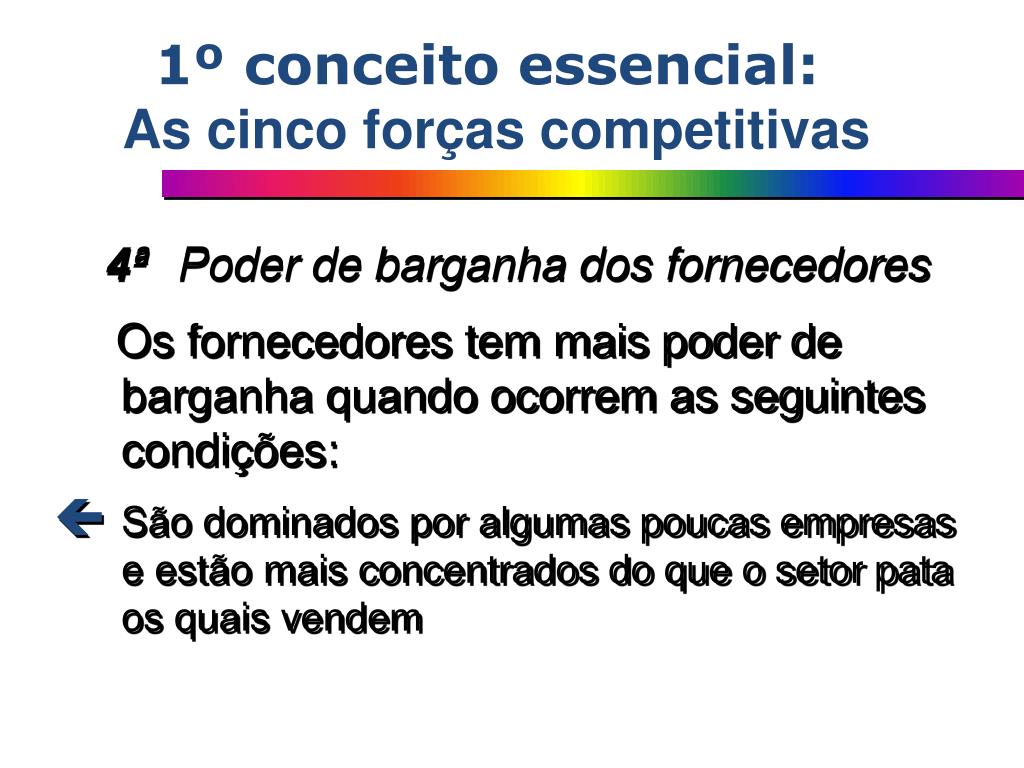 1º conceito essencial:As cinco forças competitivas 4ªPoder de barganha dos fornecedores Os fornecedores tem mais poder de barganha quando ocorrem as seguintes condições: • São dominados por algumas poucas empresas e estão mais concentrados do que o setor pata os quais vendem