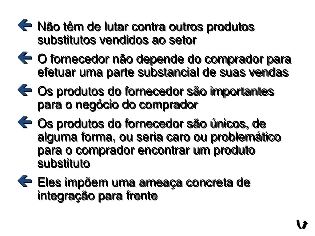 Não têm de lutar contra outros produtos substitutos vendidos ao setor • O fornecedor não depende do comprador para efetuar uma parte substancial de suas vendas • Os produtos do fornecedor são importantes para o negócio do comprador • Os produtos do fornecedor são únicos, de alguma forma, ou seria caro ou problemático para o comprador encontrar um produto substituto • Eles impõem uma ameaça concreta de integração para frente