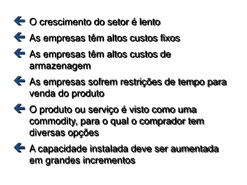 O crescimento do setor é lento • As empresas têm altos custos fixos • As empresas têm altos custos de armazenagem • As empresas sofrem restrições de tempo para venda do produto • O produto ou serviço é visto como uma commodity, para o qual o comprador tem diversas opções • A capacidade instalada deve ser aumentada em grandes incrementos