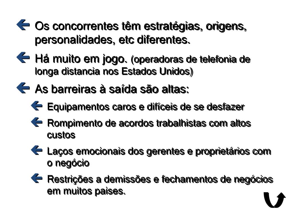Os concorrentes têm estratégias, origens, personalidades, etc diferentes. • Há muito em jogo. (operadoras de telefonia de longa distancia nos Estados Unidos) • As barreiras à saída são altas: • Equipamentos caros e difíceis de se desfazer • Rompimento de acordos trabalhistas com altos custos • Laços emocionais dos gerentes e proprietários com o negócio • Restrições a demissões e fechamentos de negócios em muitos paises.