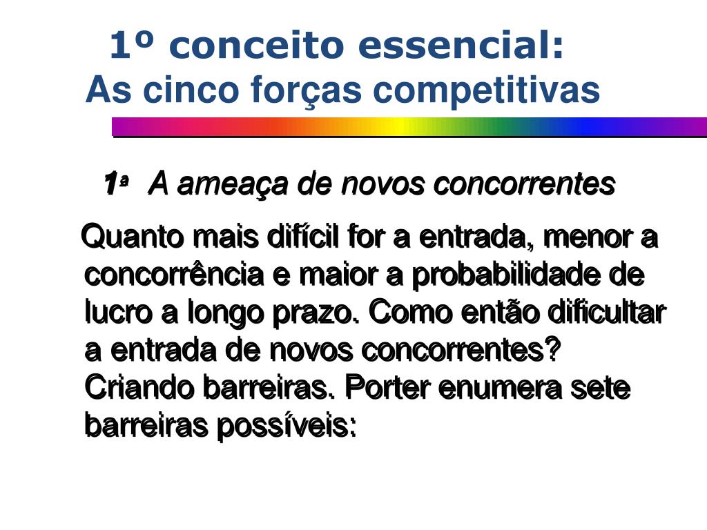 1º conceito essencial:As cinco forças competitivas 1ª A ameaça de novos concorrentes Quanto mais difícil for a entrada, menor a concorrência e maior a probabilidade de lucro a longo prazo. Como então dificultar a entrada de novos concorrentes? Criando barreiras. Porter enumera sete barreiras possíveis: