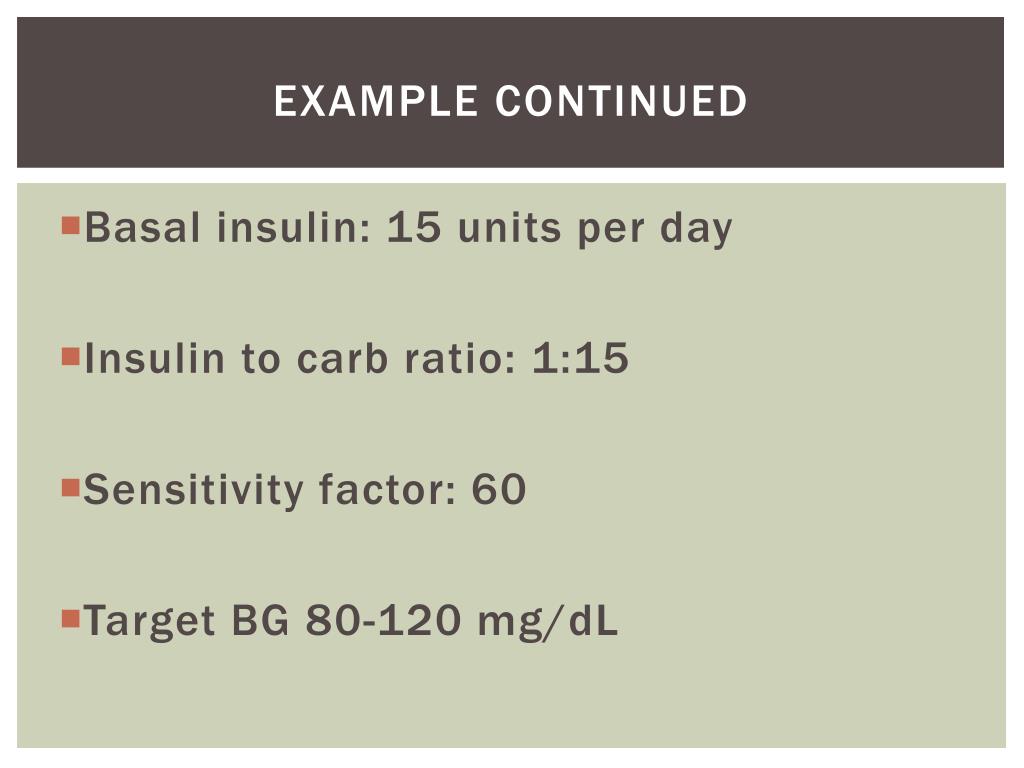 Example continued • Basal insulin: 15 units per day • Insulin to carb ratio: 1:15 • Sensitivity factor: 60 • Target BG 80-120 mg/dL