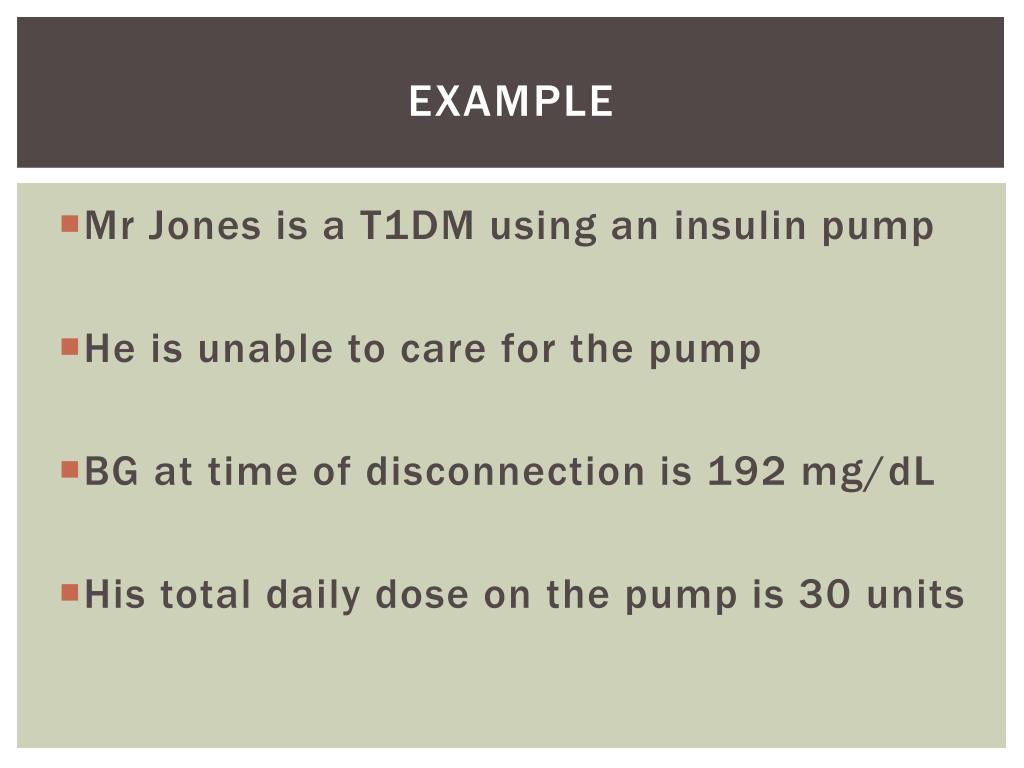 Example • Mr Jones is a T1DM using an insulin pump • He is unable to care for the pump • BG at time of disconnection is 192 mg/dL • His total daily dose on the pump is 30 units