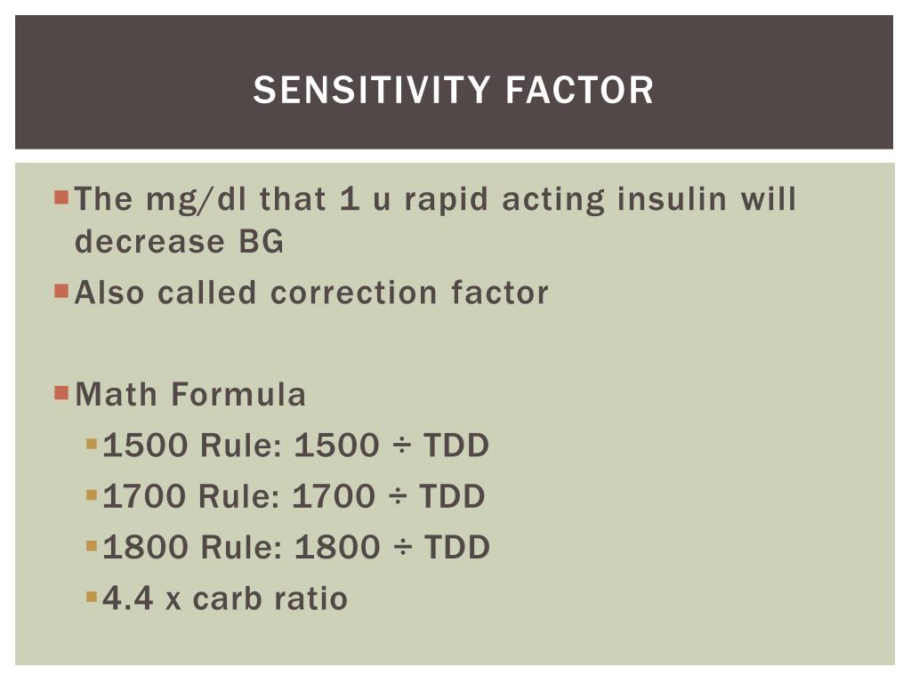 Sensitivity Factor • The mg/dl that 1 u rapid acting insulin will decrease BG • Also called correction factor • Math Formula • 1500 Rule: 1500 ÷ TDD • 1700 Rule: 1700 ÷ TDD • 1800 Rule: 1800 ÷ TDD • 4.4 x carb ratio