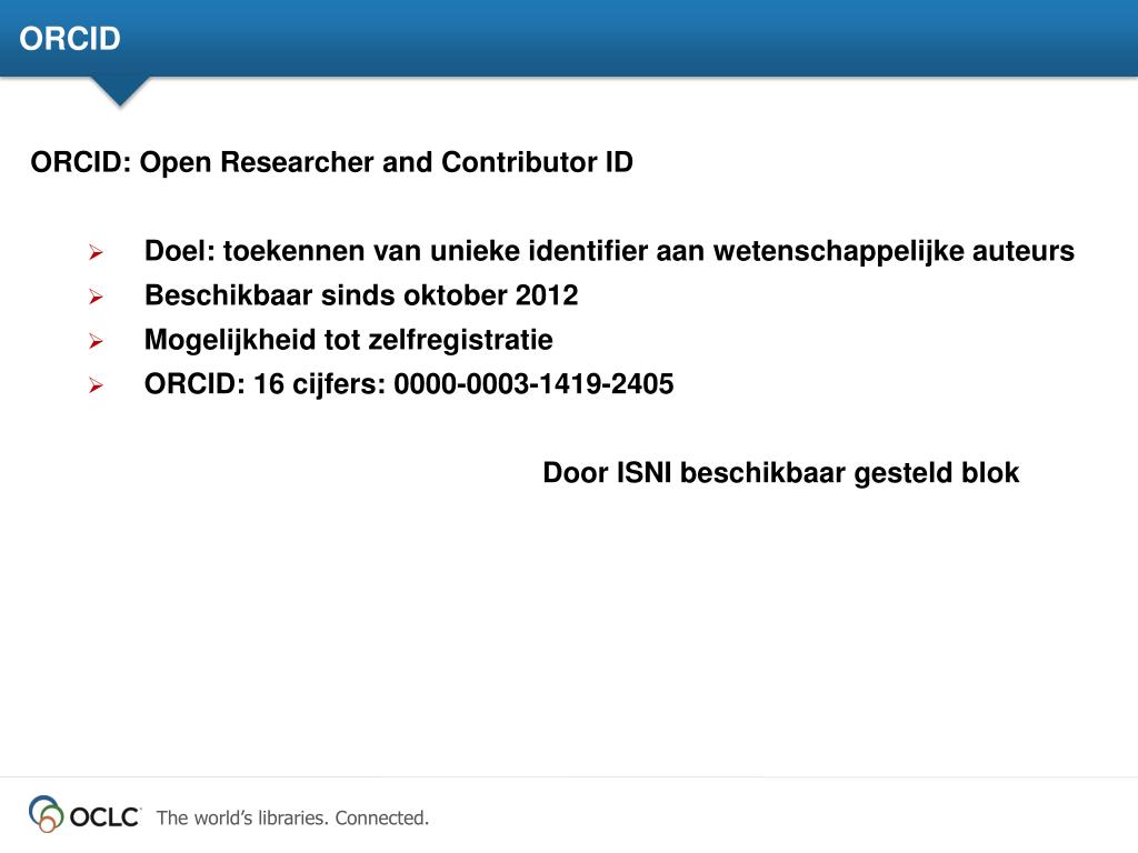 ORCID • ORCID: Open Researcher and Contributor ID • Doel: toekennen van unieke identifier aanwetenschappelijkeauteurs • Beschikbaarsindsoktober 2012 • Mogelijkheid tot zelfregistratie • ORCID: 16 cijfers: 0000-0003-1419-2405 • Door ISNI beschikbaargesteldblok