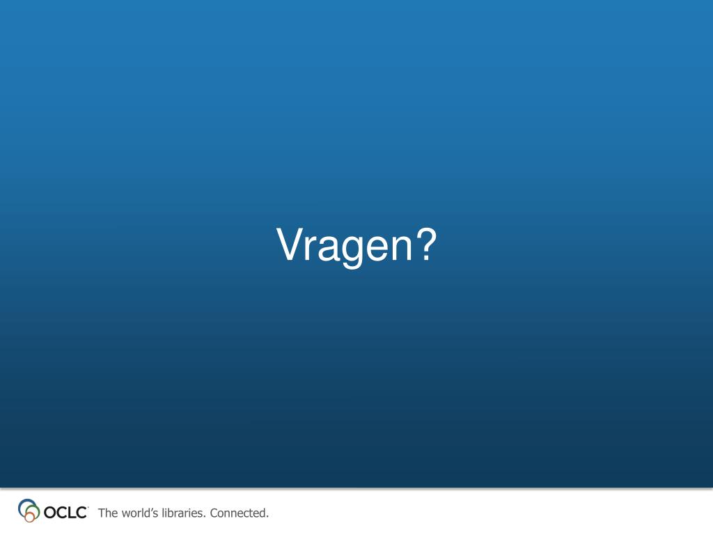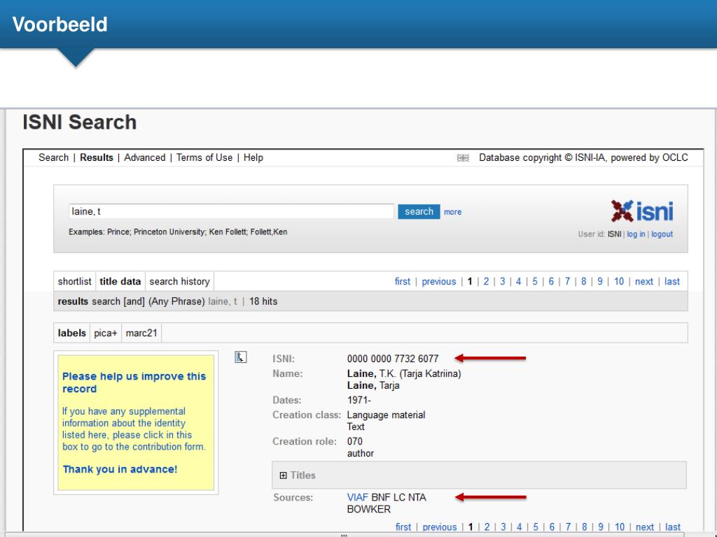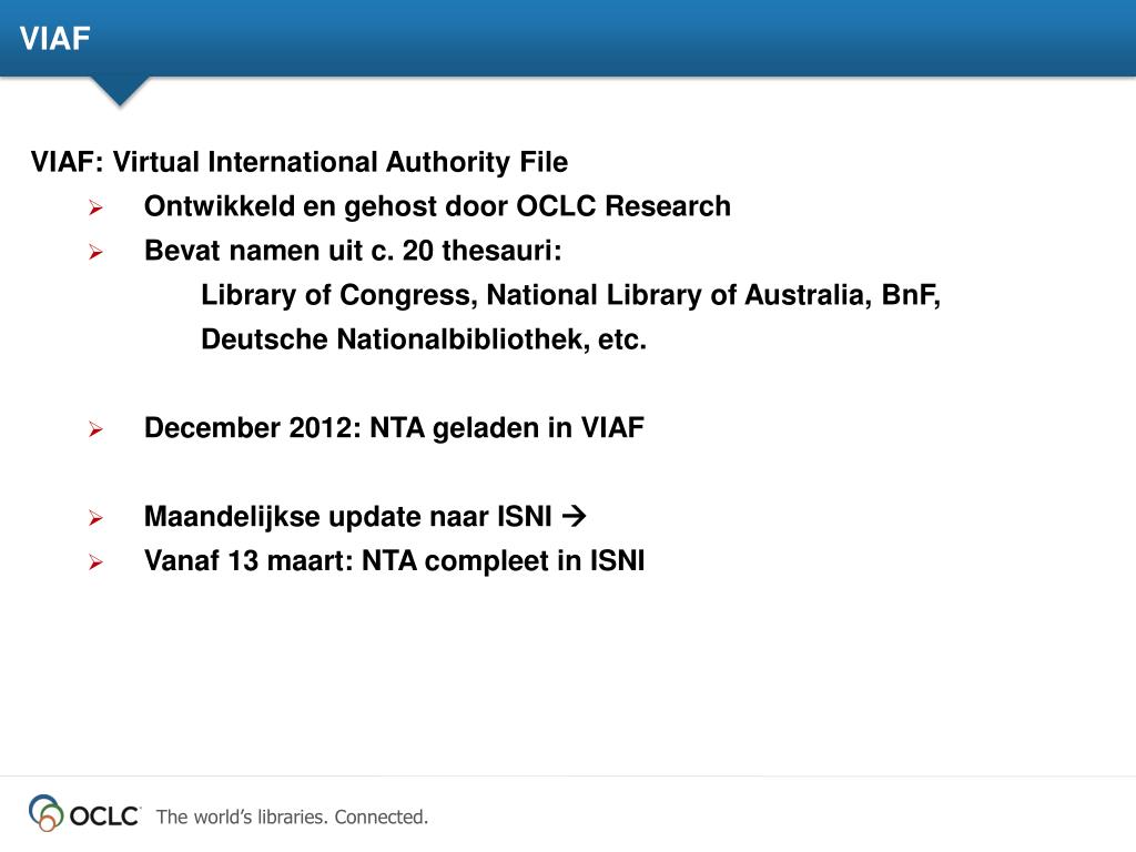 VIAF • VIAF: Virtual International Authority File • Ontwikkeld en gehost door OCLC Research • Bevat namen uit c. 20 thesauri: • Library of Congress, National Library of Australia, BnF, Deutsche Nationalbibliothek, etc. • December 2012: NTA geladen in VIAF • Maandelijkse update naar ISNI • Vanaf 13 maart: NTA compleet in ISNI