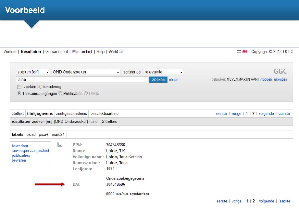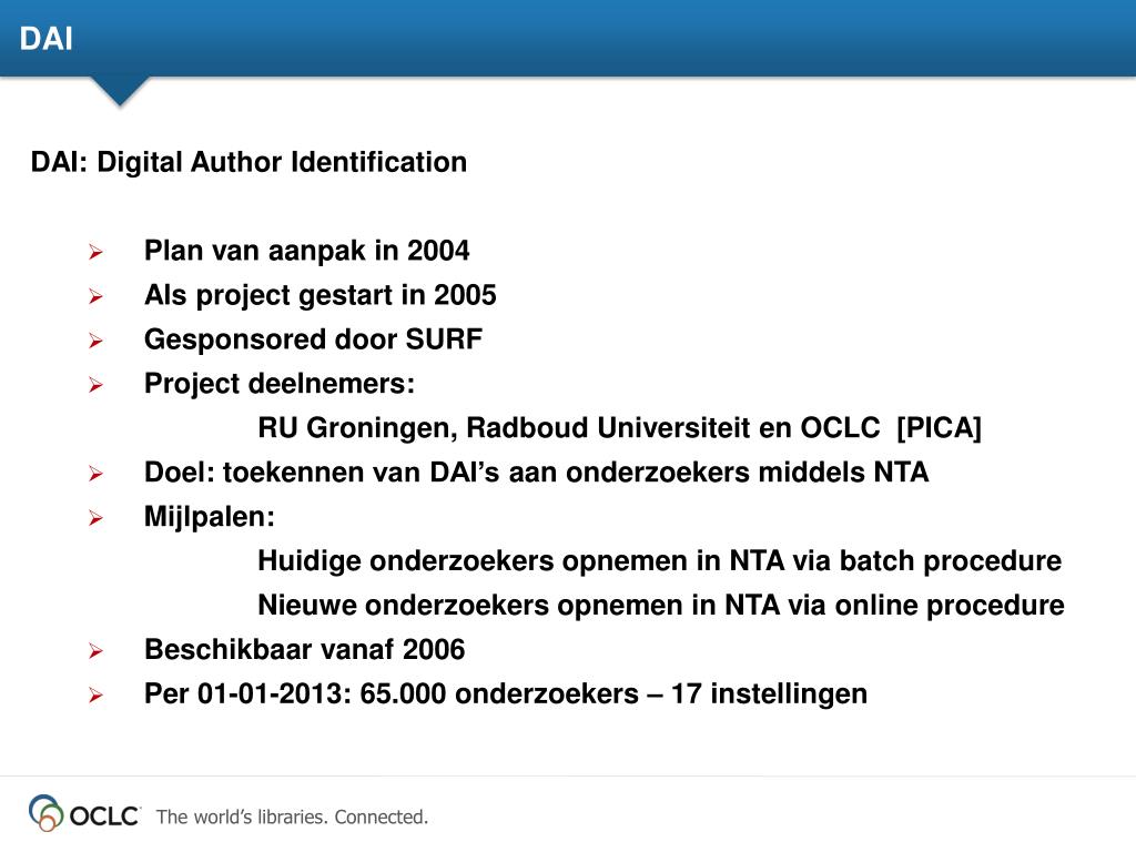 DAI • DAI: Digital Author Identification • Plan van aanpak in 2004 • Als project gestart in 2005 • Gesponsored door SURF • Project deelnemers: • RU Groningen, RadboudUniversiteit en OCLC [PICA] • Doel: toekennen van DAI’s aanonderzoekersmiddels NTA • Mijlpalen: • Huidigeonderzoekersopnemen in NTA via batch procedure • Nieuweonderzoekersopnemen in NTA via online procedure • Beschikbaarvanaf 2006 • Per 01-01-2013: 65.000 onderzoekers – 17 instellingen