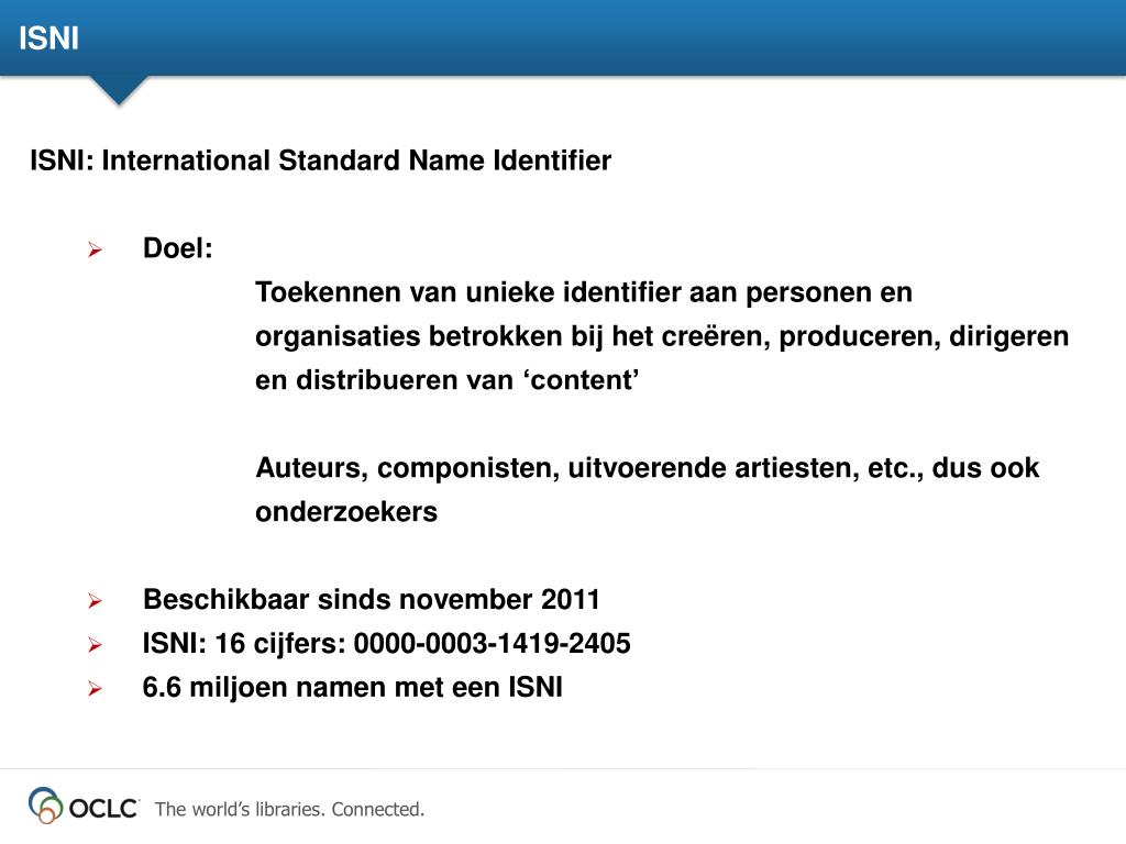 ISNI • ISNI: International Standard Name Identifier • Doel: • Toekennen van unieke identifier aan personen en organisaties betrokken bij het creëren, produceren, dirigeren en distribueren van ‘content’ • Auteurs, componisten, uitvoerende artiesten, etc., dus ook onderzoekers • Beschikbaar sinds november 2011 • ISNI: 16 cijfers: 0000-0003-1419-2405 • 6.6 miljoen namen met een ISNI