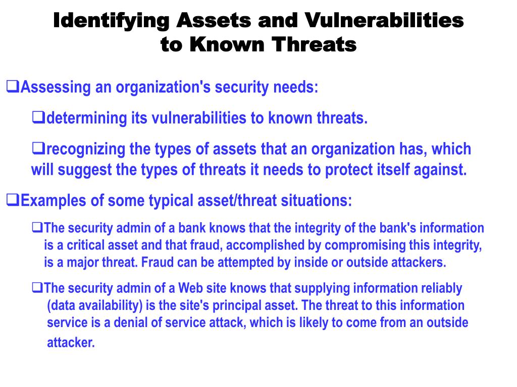 Identifying Assets and Vulnerabilities to Known Threats • Assessing an organization's security needs: • determining its vulnerabilities to known threats. • recognizing the types of assets that an organization has, which will suggest the types of threats it needs to protect itself against. • Examples of some typical asset/threat situations: • The security admin of a bank knows that the integrity of the bank's information is a critical asset and that fraud, accomplished by compromising this integrity, is a major threat. Fraud can be attempted by inside or outside attackers. • The security admin of a Web site knows that supplying information reliably (data availability) is the site's principal asset. The threat to this information service is a denial of service attack, which is likely to come from an outside attacker.