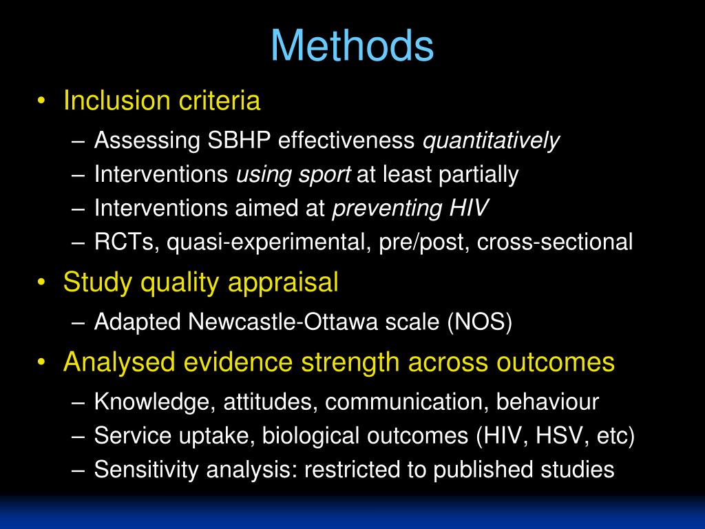 Methods • Inclusion criteria • Assessing SBHP effectiveness quantitatively • Interventions using sport at least partially • Interventions aimed at preventing HIV • RCTs, quasi-experimental, pre/post, cross-sectional • Study quality appraisal • Adapted Newcastle-Ottawa scale (NOS) • Analysed evidence strength across outcomes • Knowledge, attitudes, communication, behaviour • Service uptake, biological outcomes (HIV, HSV, etc) • Sensitivity analysis: restricted to published studies