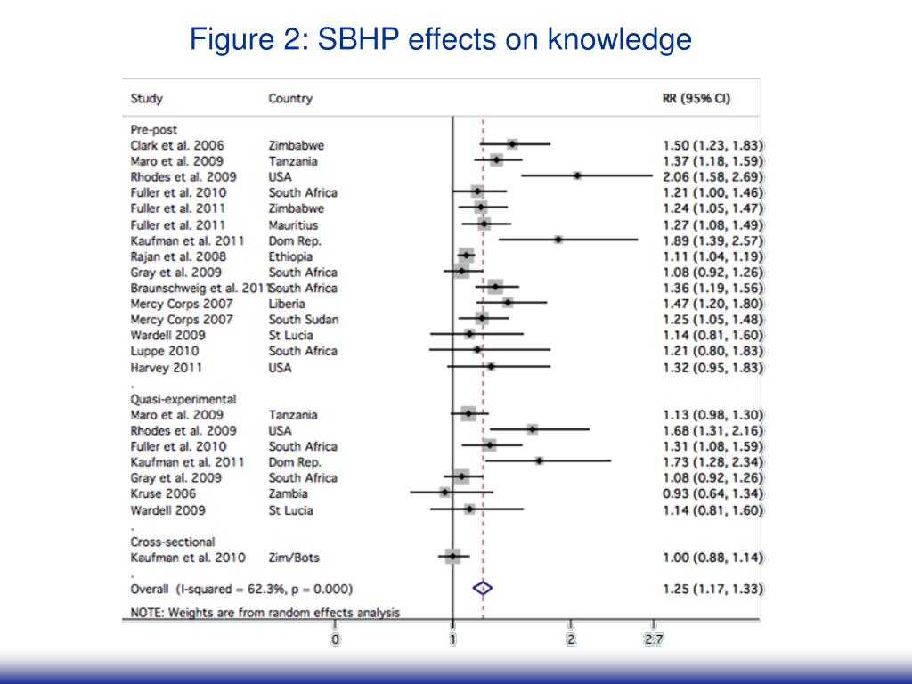 Conclusions on effectiveness of SBHP • Overall strong evidence of effect on: • HIV-related knowledge • HIV-related communication • Overall weak evidence of effect on: • HIV-related attitudes • Reported sexual behaviour • Generally low-quality studies to date • Need stronger methodology