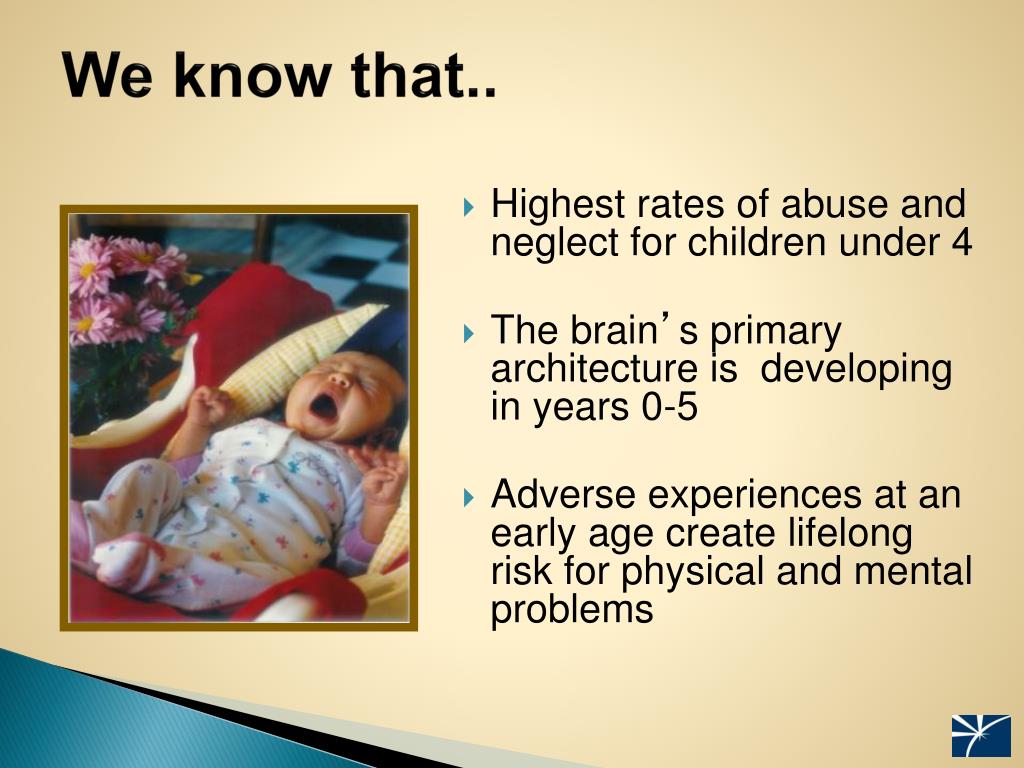We know that.. • Highest rates of abuse and neglect for children under 4 • The brain’s primary architecture is developing in years 0-5 • Adverse experiences at an early age create lifelong risk for physical and mental problems