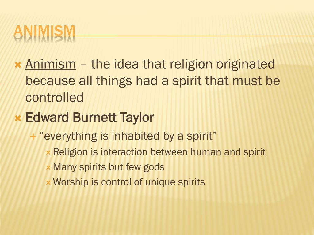 Animism – the idea that religion originated because all things had a spirit that must be controlled • Edward Burnett Taylor • “everything is inhabited by a spirit” • Religion is interaction between human and spirit • Many spirits but few gods • Worship is control of unique spirits Animism
