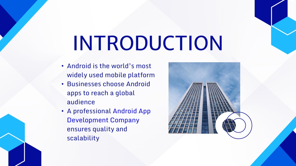 INTRODUCTION • Android is the world’s most widely used mobile platform • Businesses choose Android apps to reach a global audience • A professional Android App Development Company ensures quality and scalability