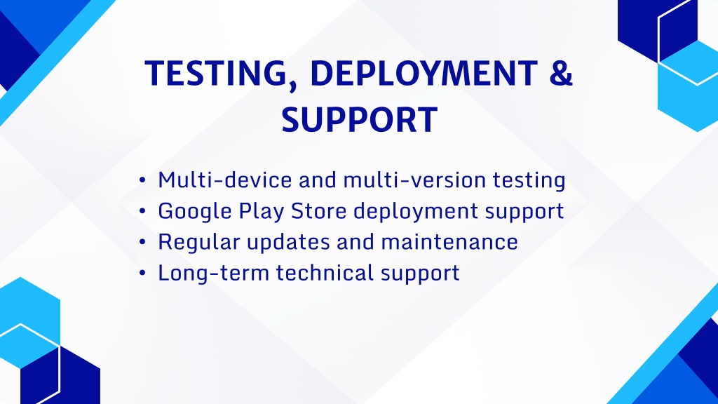 TESTING, DEPLOYMENT & SUPPORT • Multi-device and multi-version testing • Google Play Store deployment support • Regular updates and maintenance • Long-term technical support