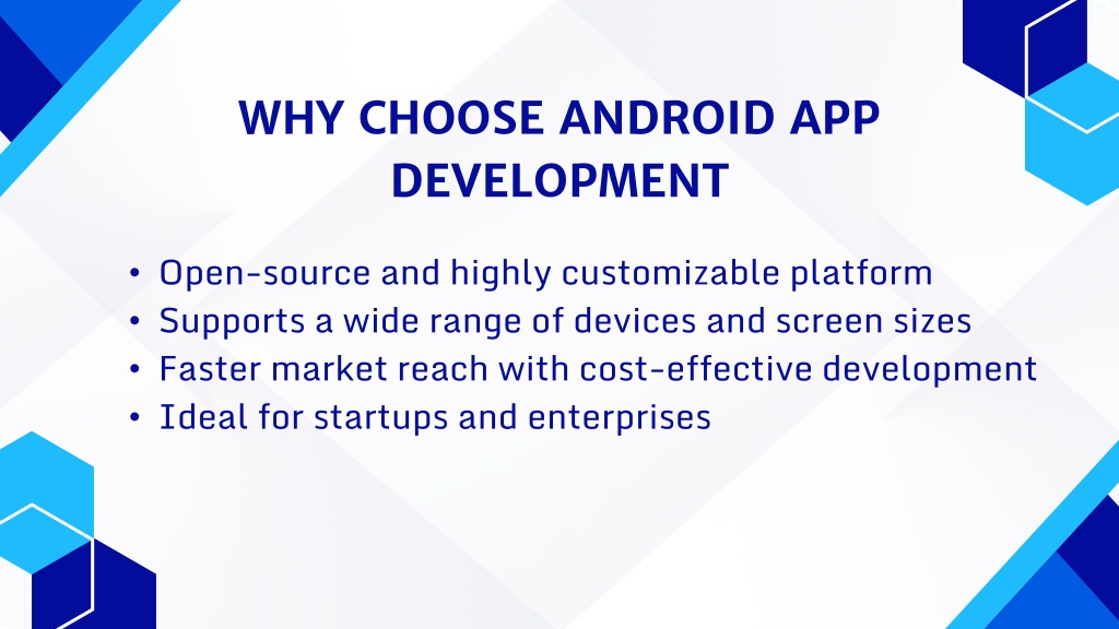 WHY CHOOSE ANDROID APP DEVELOPMENT • Open-source and highly customizable platform • Supports a wide range of devices and screen sizes • Faster market reach with cost-effective development • Ideal for startups and enterprises