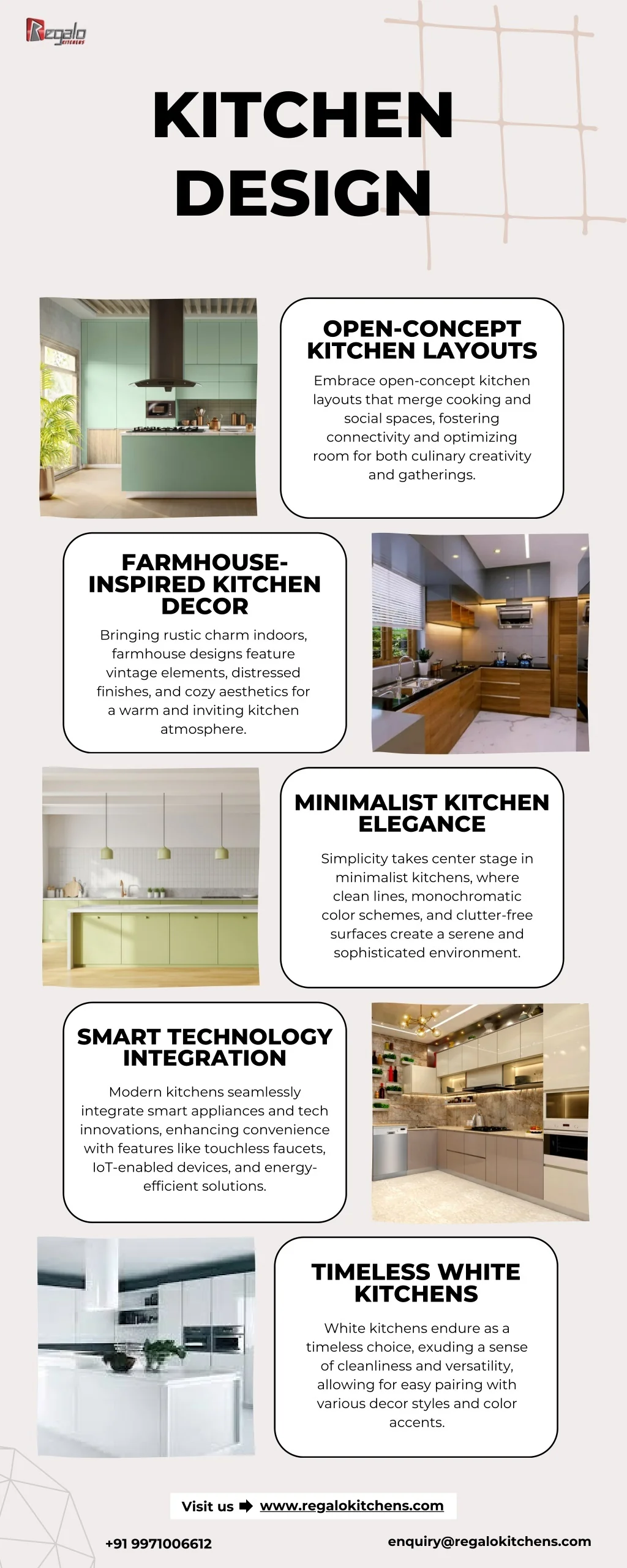 KITCHEN DESIGN OPEN-CONCEPT KITCHEN LAYOUTS Embrace open-concept kitchen layouts that merge cooking and social spaces, fostering connectivity and optimizing room for both culinary creativity and gatherings. FARMHOUSE- INSPIRED KITCHEN DECOR Bringing rustic charm indoors, farmhouse designs feature vintage elements, distressed finishes, and cozy aesthetics for a warm and inviting kitchen atmosphere. MINIMALIST KITCHEN ELEGANCE Simplicity takes center stage in minimalist kitchens, where clean lines, monochromatic color schemes, and clutter-free surfaces create a serene and sophisticated environment. SMART TECHNOLOGY INTEGRATION Modern kitchens seamlessly integrate smart appliances and tech innovations, enhancing convenience with features like touchless faucets, IoT-enabled devices, and energy- efficient solutions. TIMELESS WHITE KITCHENS White kitchens endure as a timeless choice, exuding a sense of cleanliness and versatility, allowing for easy pairing with various decor styles and color accents. www.regalokitchens.com Visit us enquiry@regalokitchens.com +91 9971006612