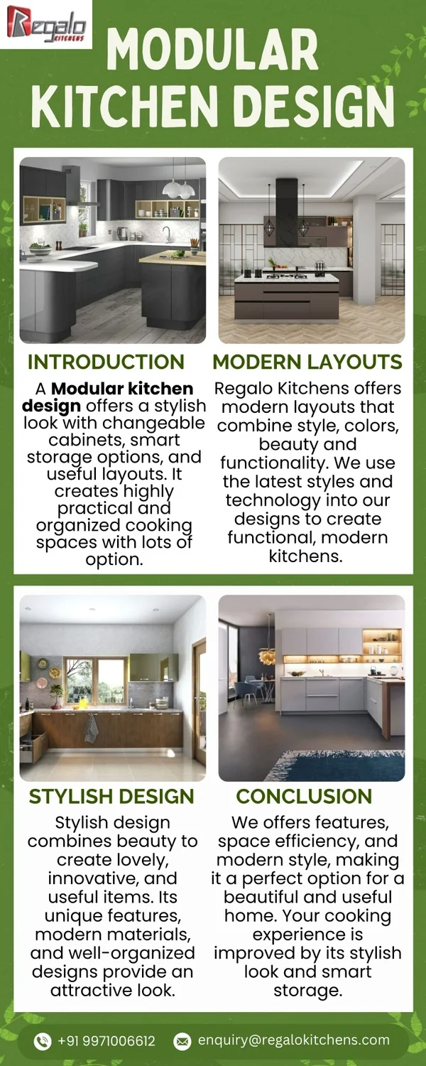 MODULAR KITCHEN DESIGN INTRODUCTION A Modular kitchen design offers a stylish look with changeable cabinets, smart storage options, and useful layouts. It creates highly practical and organized cooking spaces with lots of option. MODERN LAYOUTS Regalo Kitchens offers modern layouts that combine style, colors, beauty and functionality. We use the latest styles and technology into our designs to create functional, modern kitchens. STYLISH DESIGN Stylish design combines beauty to create lovely, innovative, and useful items. Its unique features, modern materials, and well-organized designs provide an attractive look. CONCLUSION We offers features, space efficiency, and modern style, making it a perfect option for a beautiful and useful home. Your cooking experience is improved by its stylish look and smart storage. enquiry@regalokitchens.com +91 9971006612