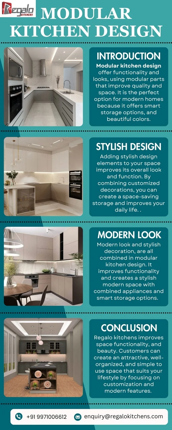 MODULAR KITCHEN DESIGN INTRODUCTION Modular kitchen design offer functionality and looks, using modular parts that improve quality and space. It is the perfect option for modern homes because it offers smart storage options, and beautiful colors. STYLISH DESIGN Adding stylish design elements to your space improves its overall look and function. By combining customized decorations, you can create a space-saving storage and improves your daily life. . MODERN LOOK Modern look and stylish decoration, are all combined in modular kitchen design. It improves functionality and creates a stylish modern space with combined appliances and smart storage options. CONCLUSION Regalo kitchens improves space functionality, and beauty. Customers can create an attractive, well- organized, and simple to use space that suits your lifestyle by focusing on customization and modern features. enquiry@regalokitchens.com +91 9971006612