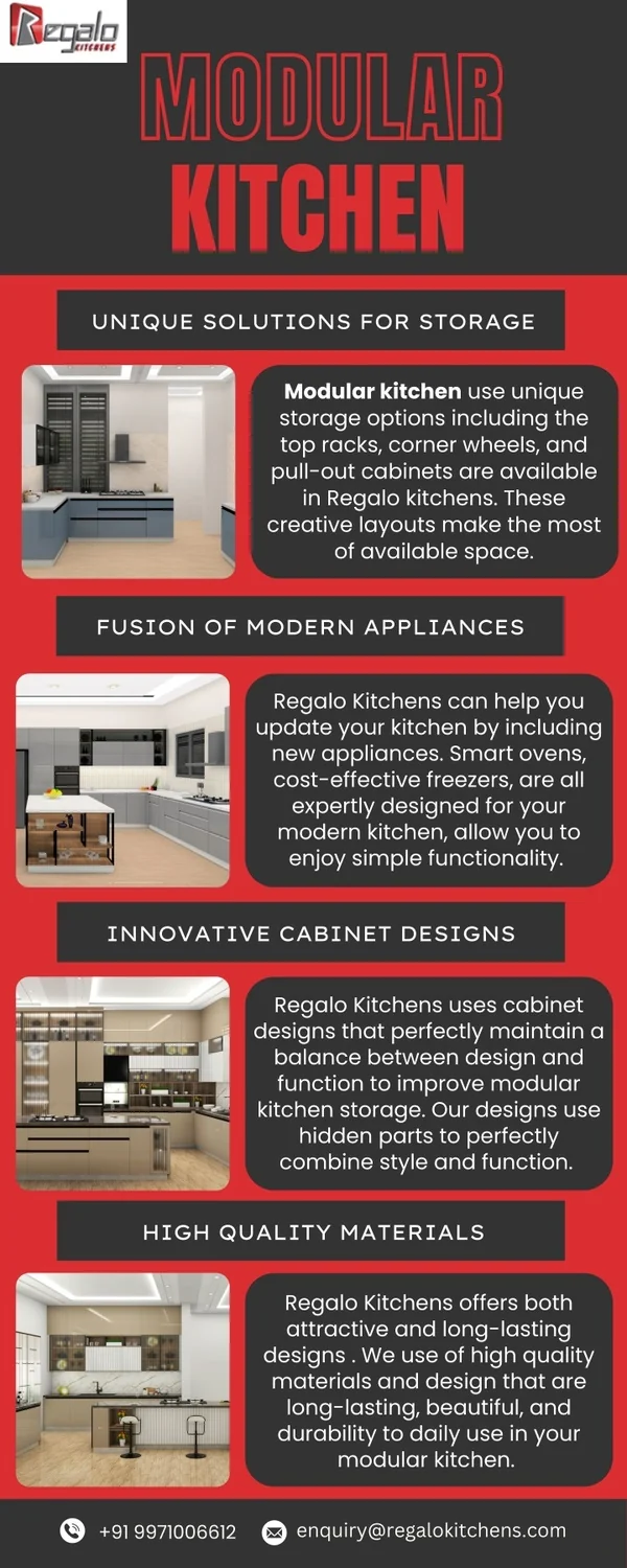 A Modular kitchen is a stylish, modern, and highly useful kitchen layout that improves available space and increases functionality. It has ready-made drawers, cabinets, and shelves that can be organized to fit unique design ideas and demands. These kitchens are a great option for modern homes because of their nice organization and effective storage. Regalo Kitchens focuses on providing creative modular kitchen options that are customized to your preferences.<br><br>More Info: https://www.regalokitchens.com/modular-kitchen.php
