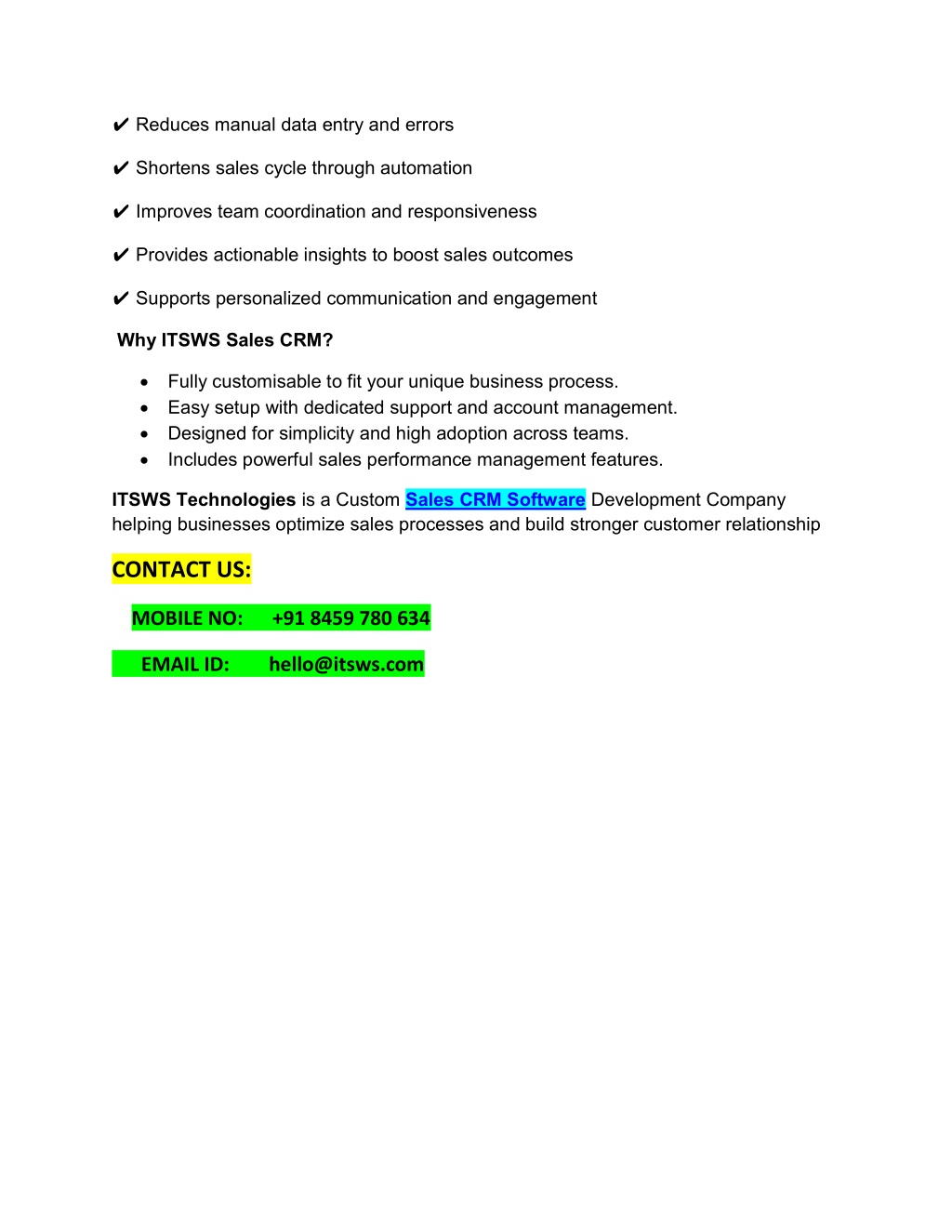 3. ✔ Reduces manual data entry and errors ✔ Shortens sales cycle through automation ✔ Improves team coordination and responsiveness ✔ Provides actionable insights to boost sales outcomes ✔ Supports personalized communication and engagement Why ITSWS Sales CRM?  Fully customisable to fit your unique business process.  Easy setup with dedicated support and account management.  Designed for simplicity and high adoption across teams.  Includes powerful sales performance management features. ITSWS Technologies is a Custom Sales CRM Software Development Company helping businesses optimize sales processes and build stronger customer relationship CONTACT US: MOBILE NO: +91 8459 780 634 EMAIL ID: hello@itsws.com