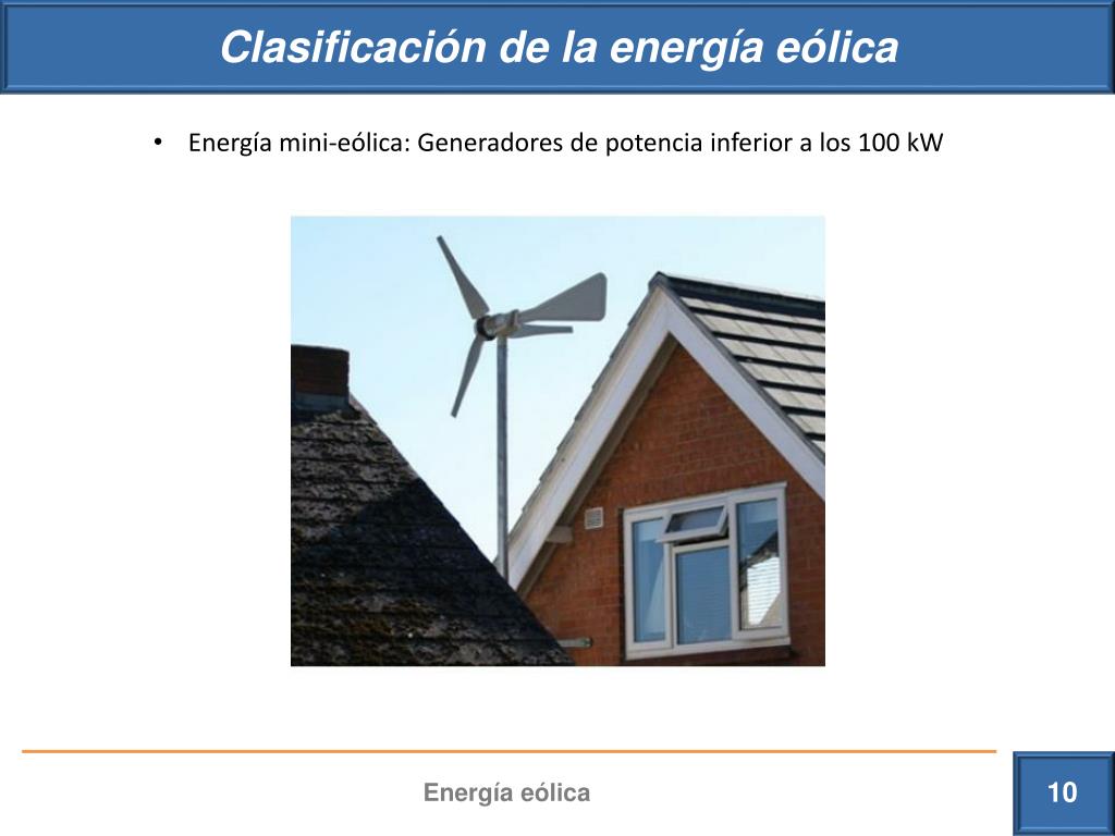Clasificación de la energía eólica • Energía mini-eólica: Generadores de potencia inferior a los 100 kW Energía eólica