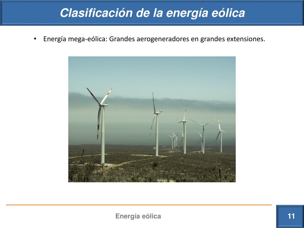 Clasificación de la energía eólica • Energía mega-eólica: Grandes aerogeneradores en grandes extensiones. Energía eólica