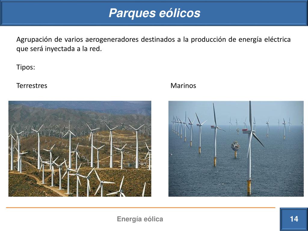 Parques eólicos Agrupación de varios aerogeneradores destinados a la producción de energía eléctrica que será inyectada a la red. Tipos: Terrestres Marinos Energía eólica